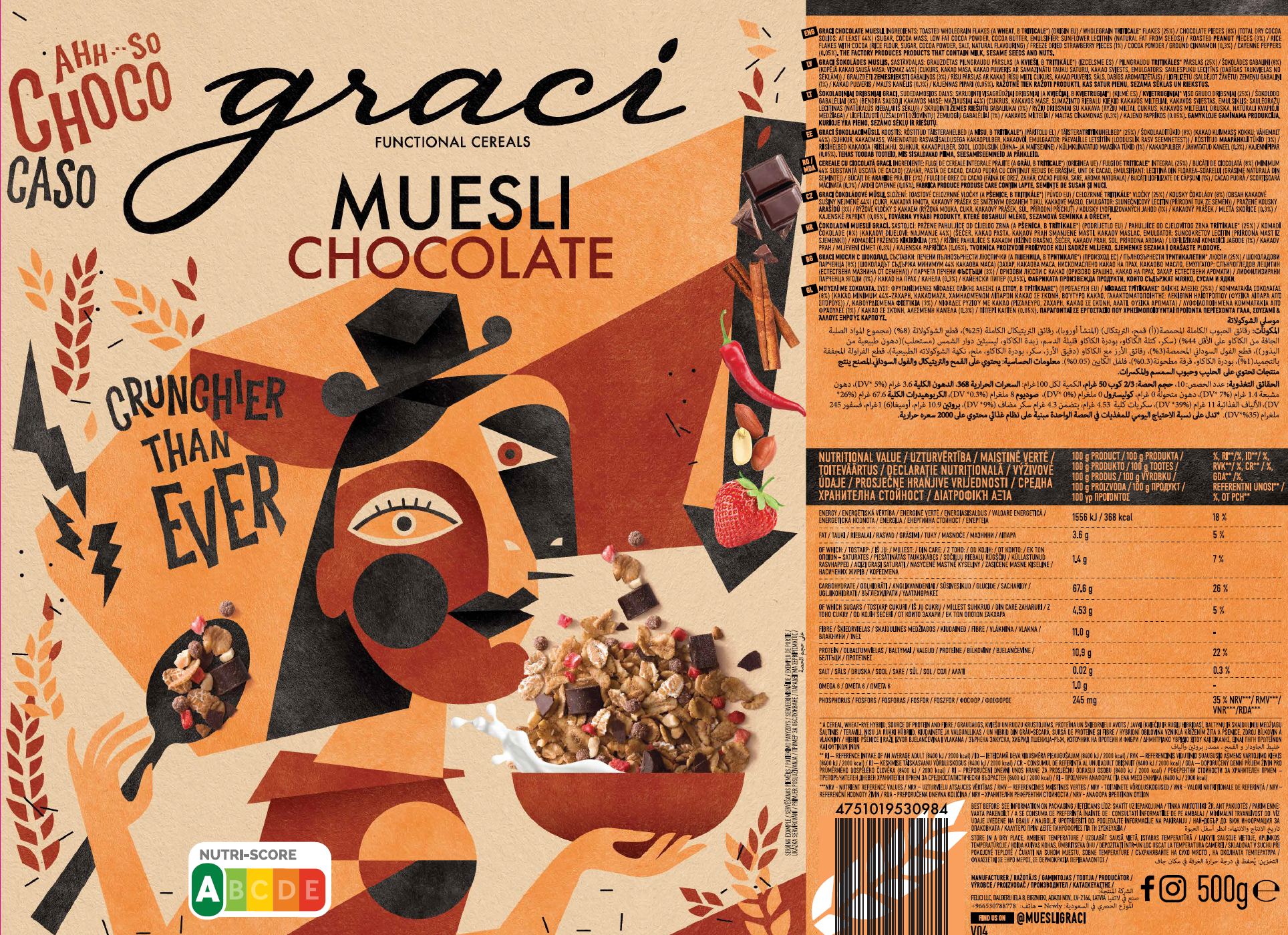 Toasted wholegrain wheat flakes, toasted wholegrain tropical flakes (wheat), dark chocolate pieces (sugar, cocoa mass, cocoa butter), rice flour, cocoa powder, sunflower lecithin (emulsifier), natural flavorings, rice flakes, peanuts, rice crisps, salt.