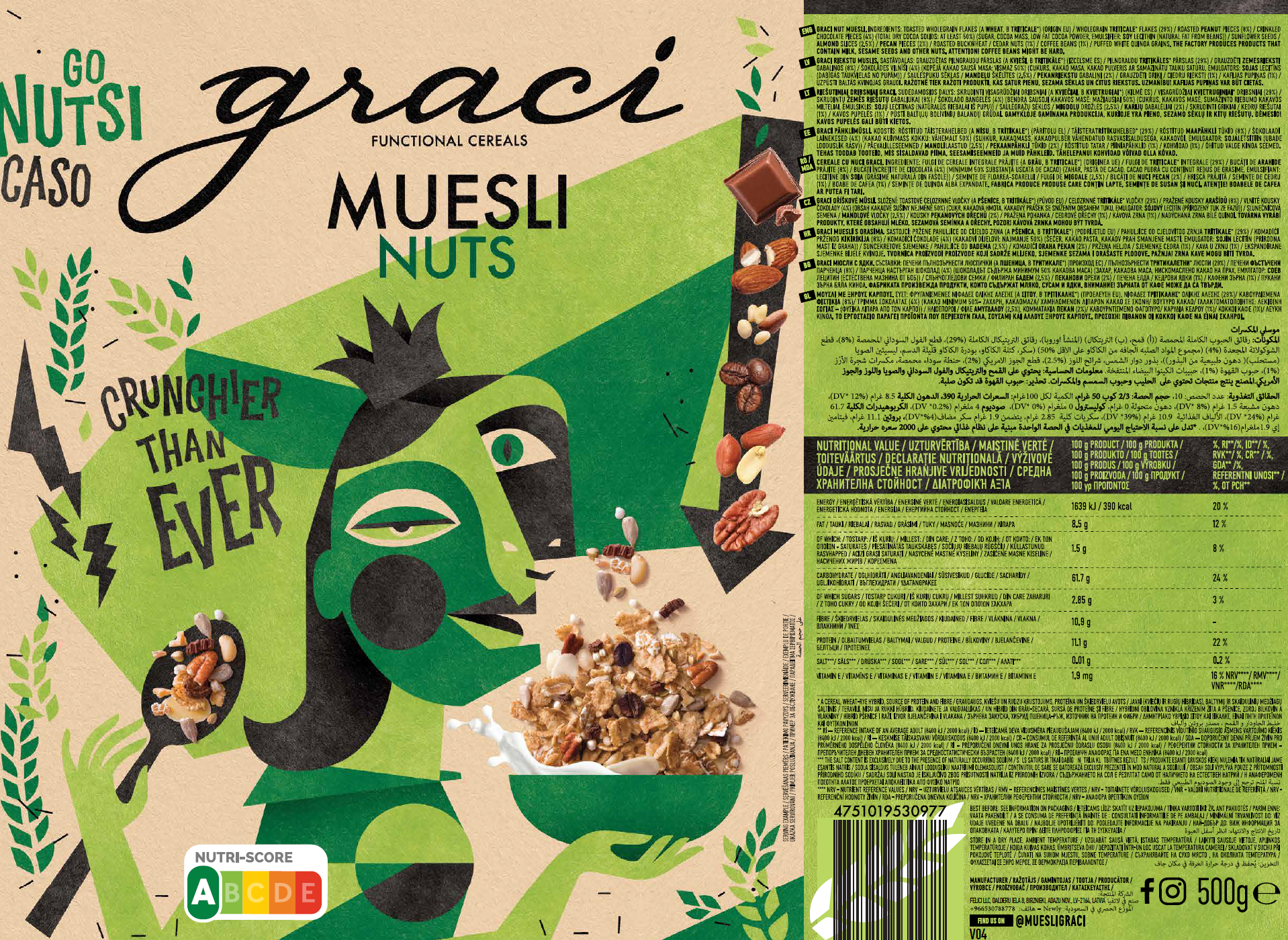 Whole grain oat flakes, sugar, roasted peanuts, roasted hazelnuts, roasted almonds, roasted cashew nuts, cocoa mass, cocoa butter, rice crisps (rice flour, sugar, salt), sunflower oil, natural flavorings, salt.