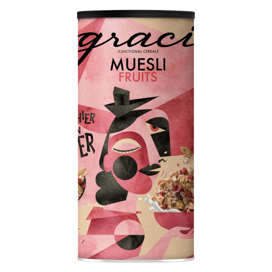 Toasted wholegrain wheat flakes, toasted wholegrain tropical flakes (wheat), date pieces, rice flour, dried goji berries, carrot powder, dried white mulberries, dried apple pieces, freeze-dried raspberry pieces.